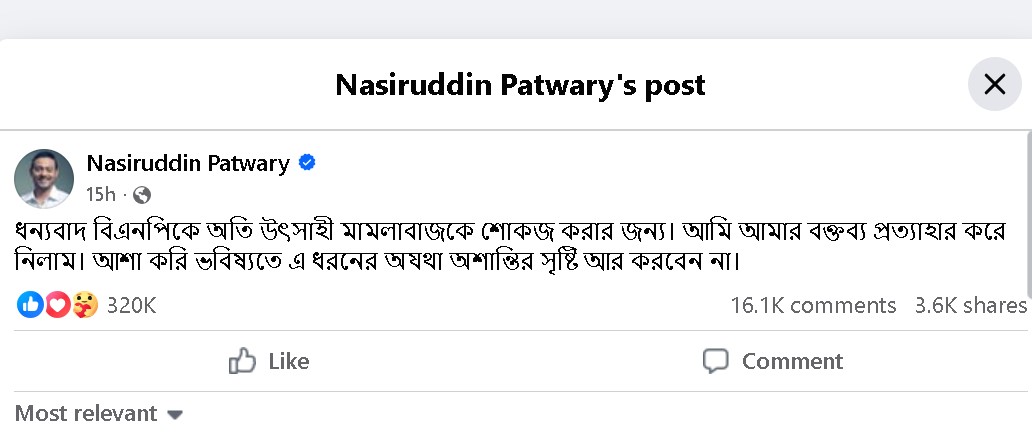 এর আগে, পাটওয়ারীর বিরুদ্ধে মামলা করা রমনা থানা বিএনপির সভাপতিকে শোকজ করে বিএনপি। এরপরই এই পোস্ট দেন নাসীরুদ্দীন।