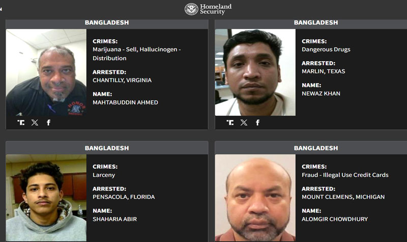 প্রেসিডেন্ট ট্রাম্পের নির্বাচনী অঙ্গীকার অনুযায়ী অবৈধ অভিবাসীদের বিরুদ্ধে চলমান বিশেষ অভিযানে ১০ বাংলাদেশিকে আটক করা হয়। তাদের বিরুদ্ধে শিশু নির্যাতন, ধর্ষণ, যৌন সহিংসতা, মাদক পাচার, প্রতারণা, ক্রেডিট কার্ড জালিয়াতি, সশস্ত্র ডাকাতি-ছিনতাই এবং হামলার মতো নানা অপরাধের অভিযোগ রয়েছে।